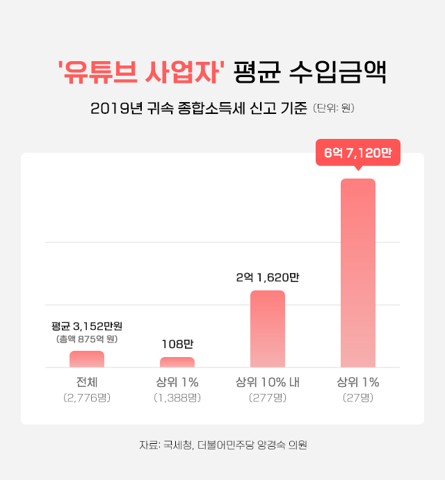 양경숙 더불어민주당 의원이 국세청에서 받은 2019년도 소득신고 자료에 따르면, 크리에이터 상위 1%의 연평균 수입은 6억 7,100만을 추정되며 상위 10%로 확대해도 2억 1,600만 원으로 고소득자에 해당합니다.